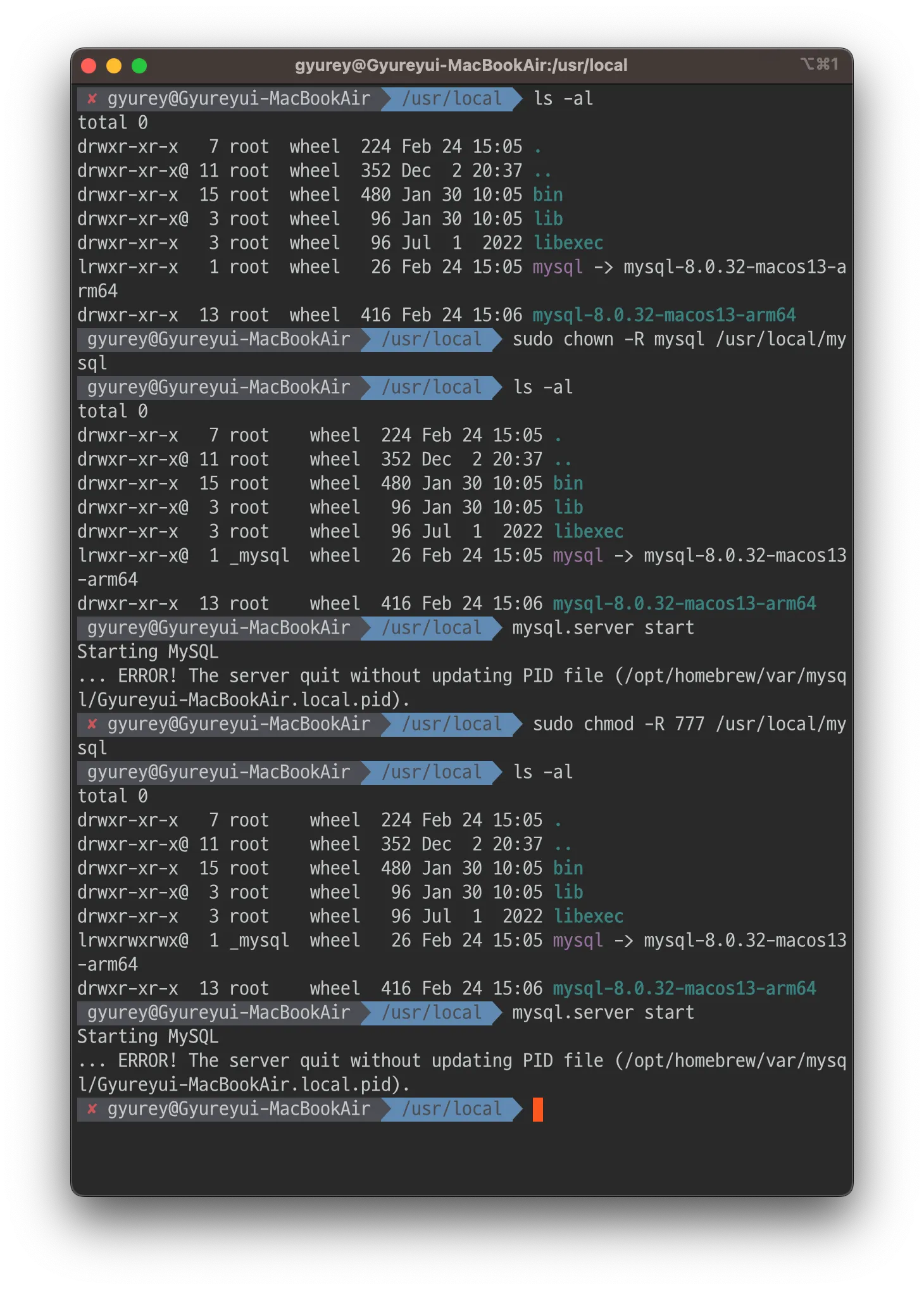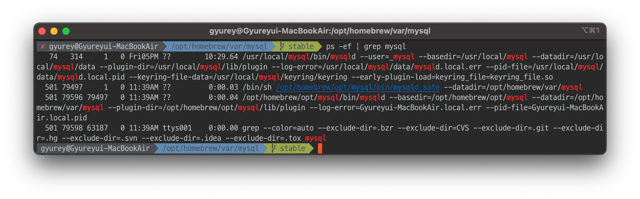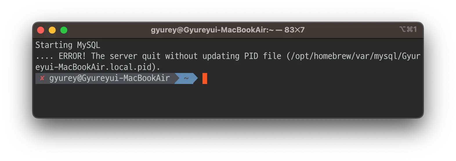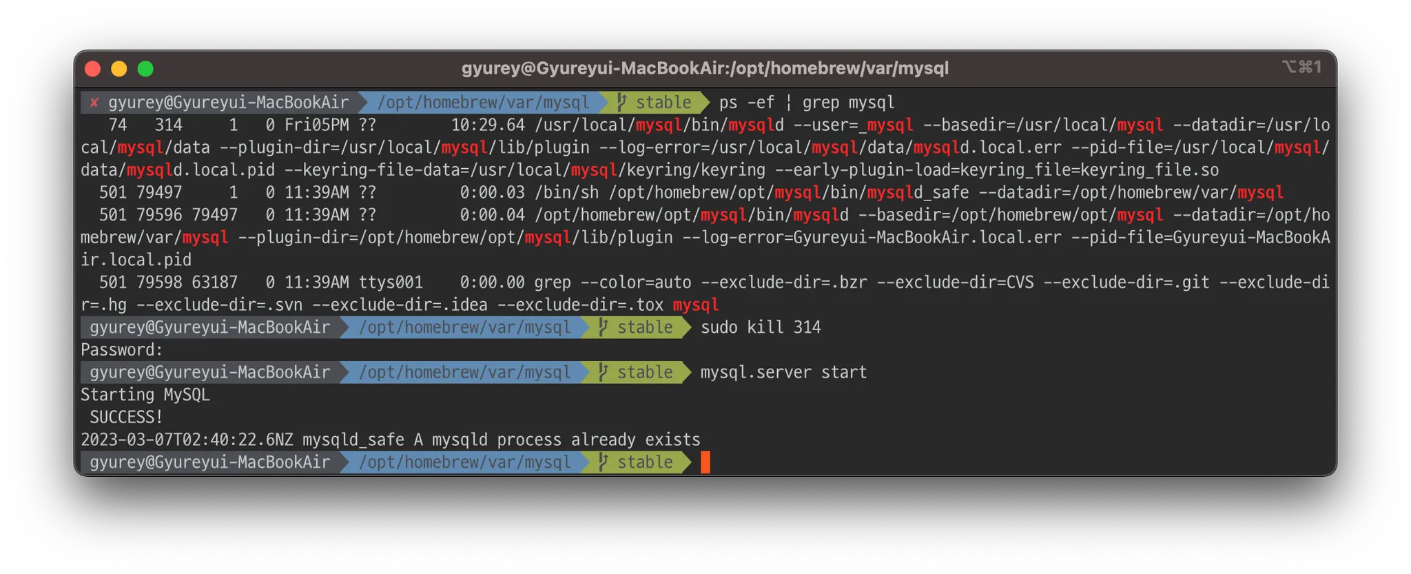 2023-03-07T01:54:57.6NZ mysqld_safe mysqld from pid file /opt/homebrew/var/mysql/Gyureyui-MacBookAir.local.pid ended