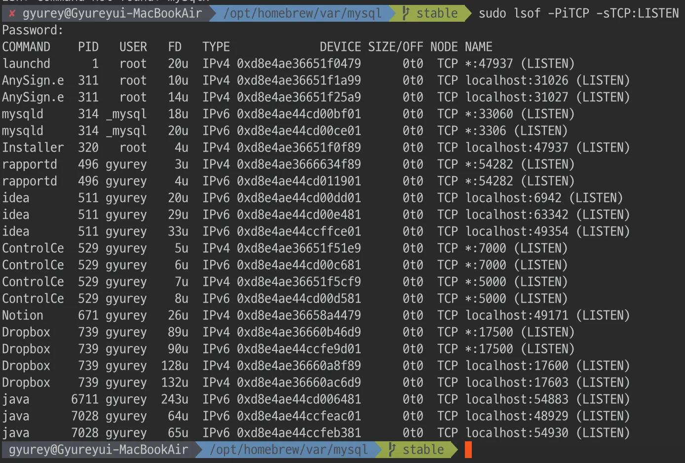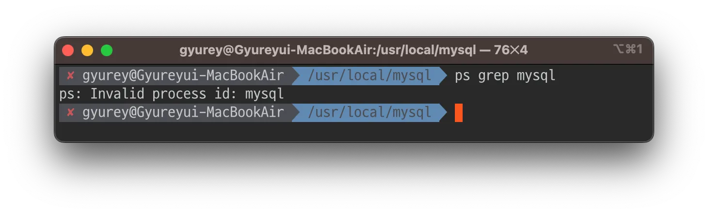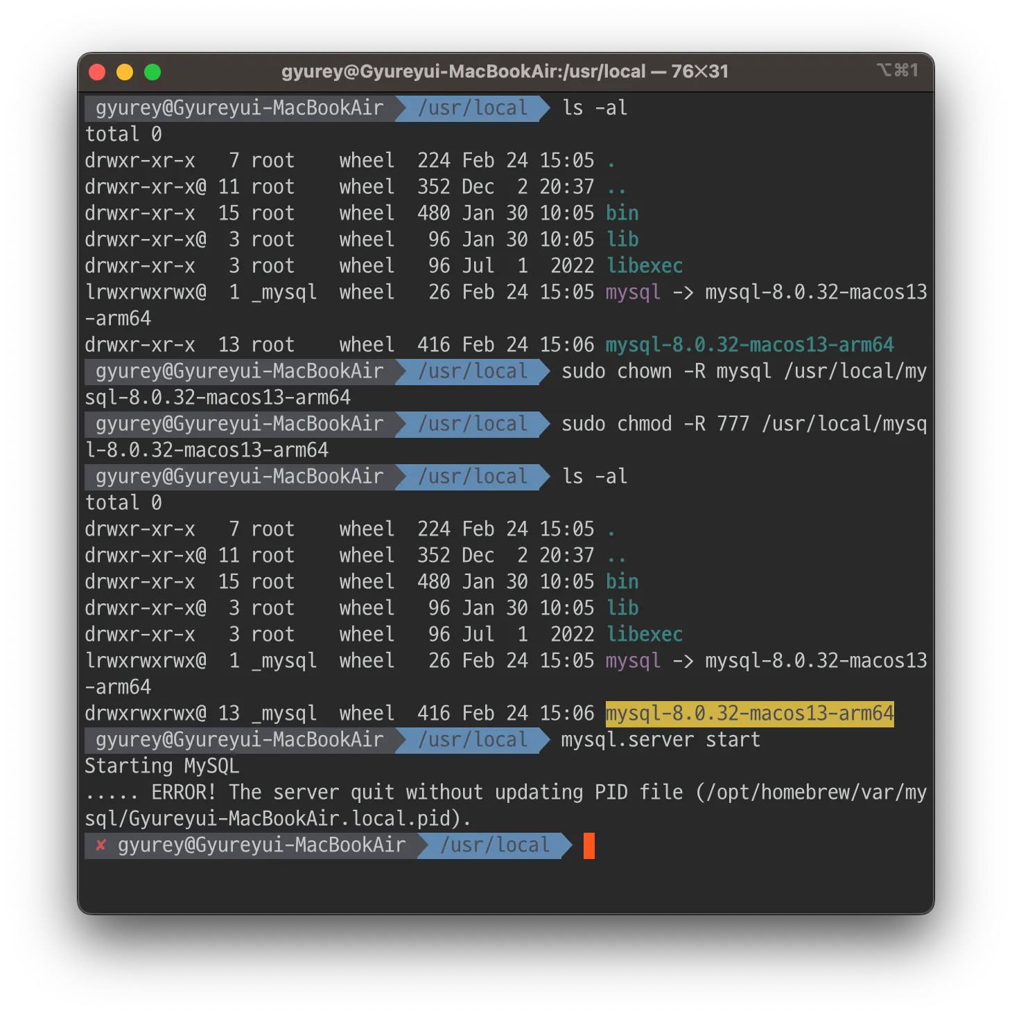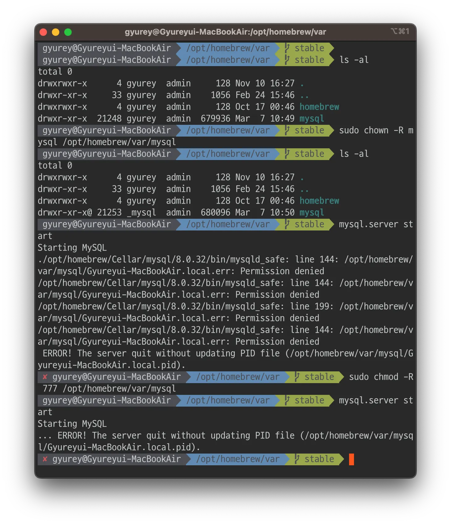 2023-03-07T01:54:57.6NZ mysqld_safe mysqld from pid file /opt/homebrew/var/mysql/Gyureyui-MacBookAir.local.pid ended