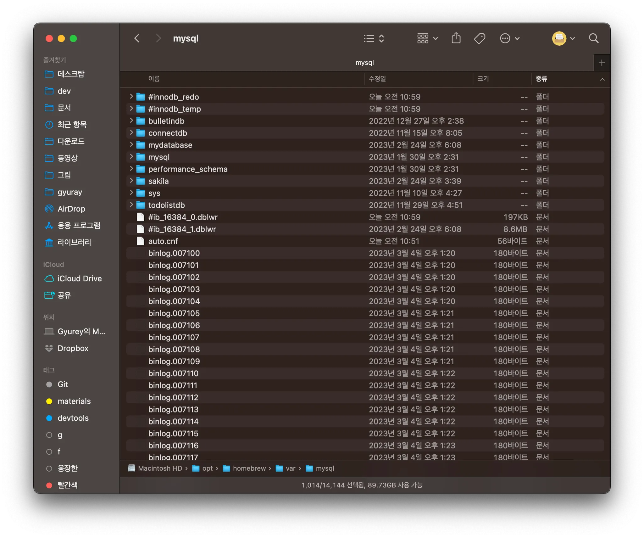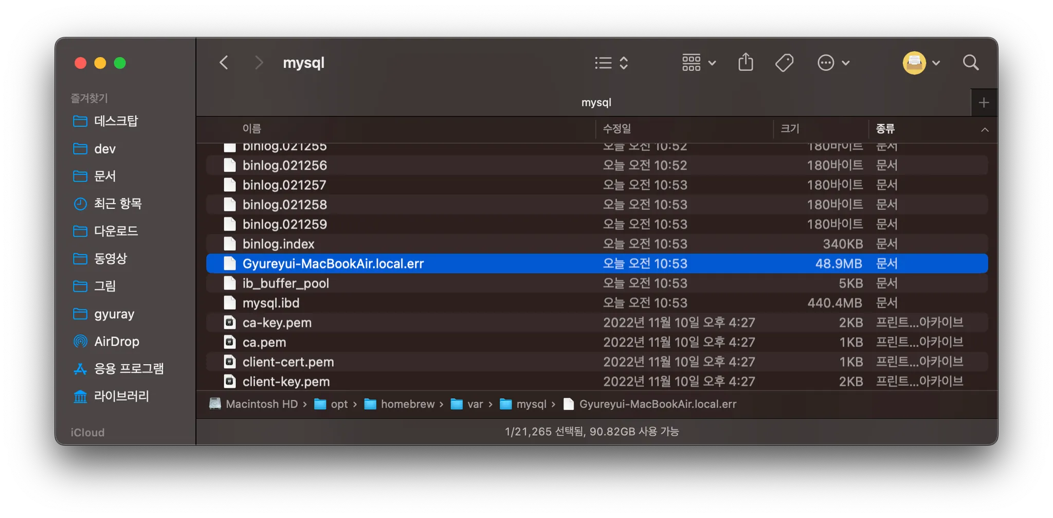 보니까 binlog 파일이 며칠 전 mysql 강의를 들은 이후로 몇만개가 초단위로 생성되고 있었음. 용량은 600mb가 넘어가고 있었음..