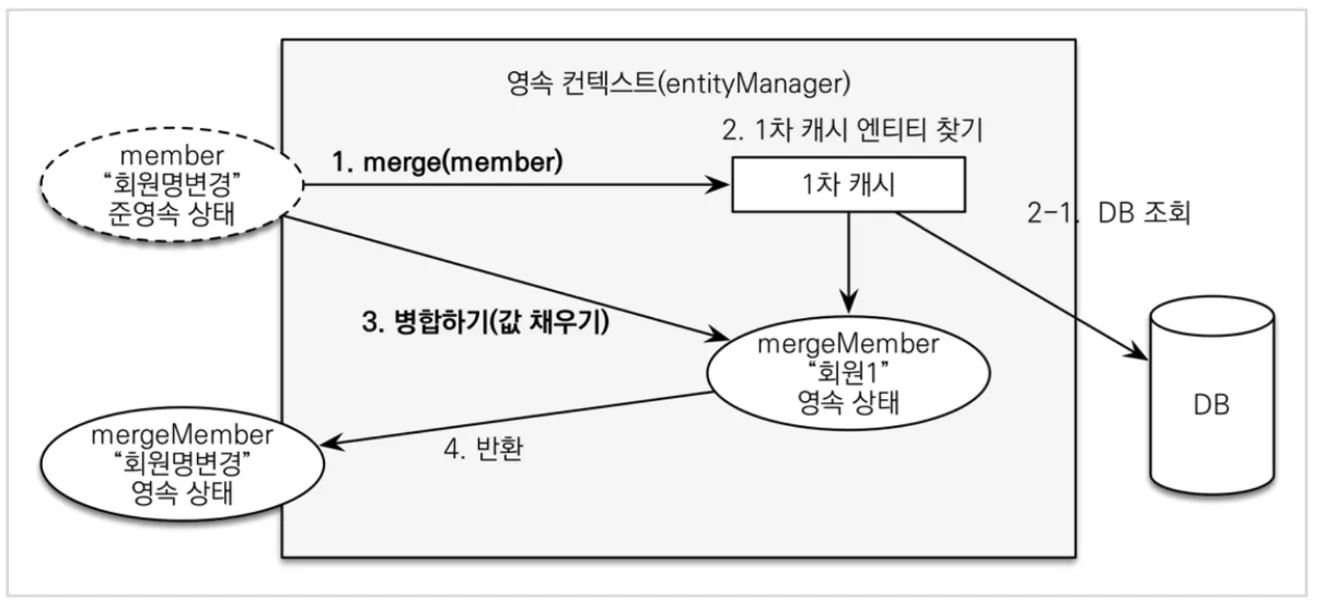 준영속 엔티티를 merge를 통해 영속성 컨텍스트에 새로 넣거나 병합할 수 있음