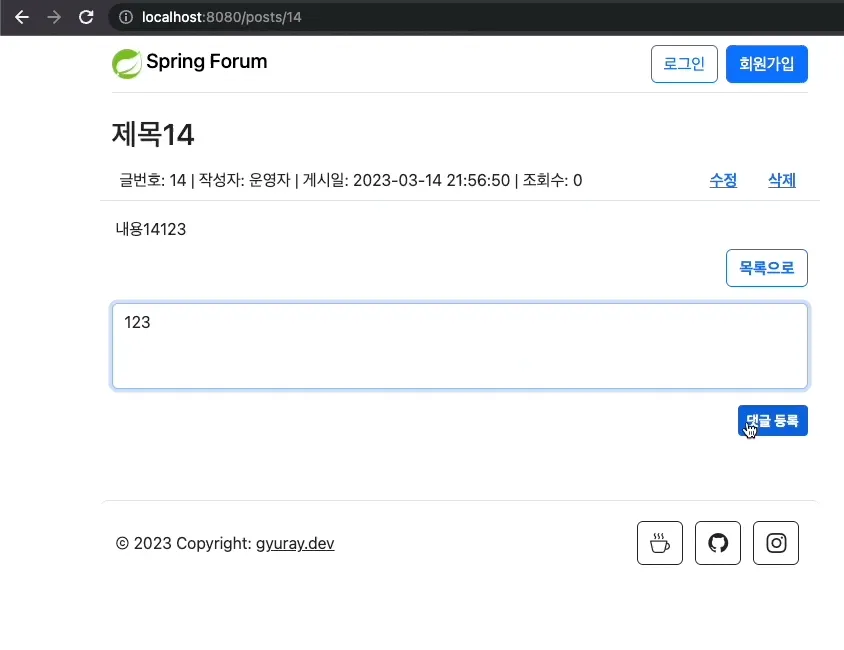 수정 버튼을 누르면 댓글 출력 부분을 textarea를 포함한 form으로 변경