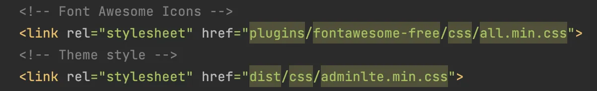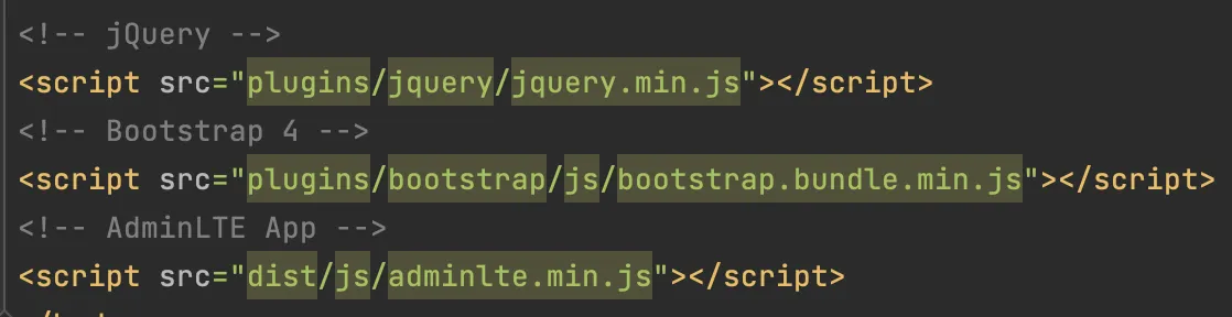 dist 파일을 보면 css와 js 파일임을 알 수 있다. 이 중 adminlte.min.css와 adminlte.min.js가 HTML 페이지에서 import되어 사용된다.