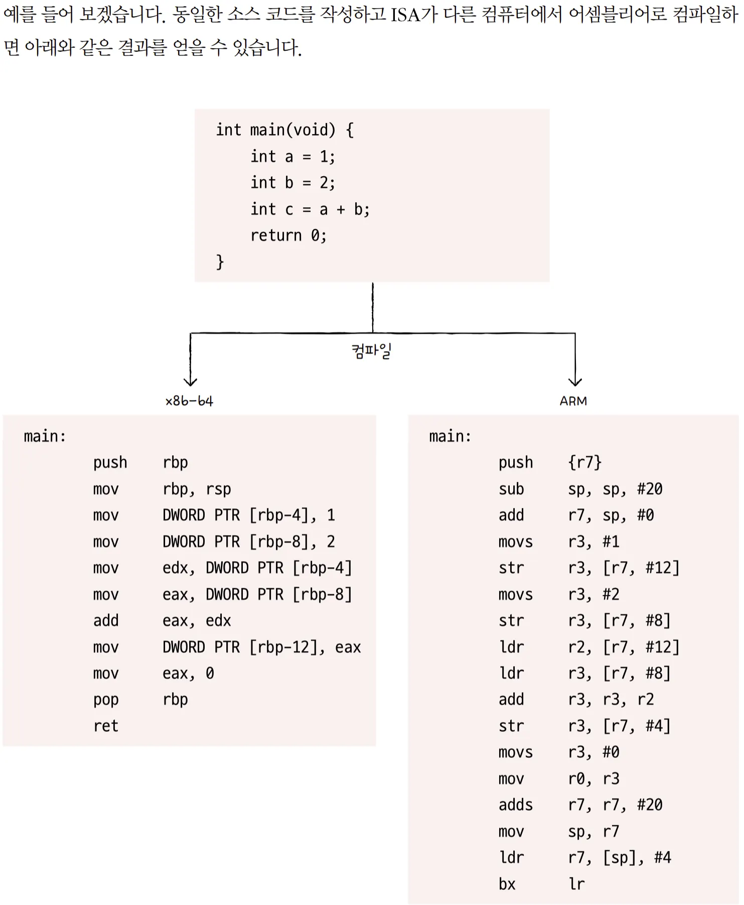 : CPU가 이해할 수 있는 명령어들의 모음. 다른 ISA를 사용하는 CPU는 명령어, 어셈블리어가 모두 다름