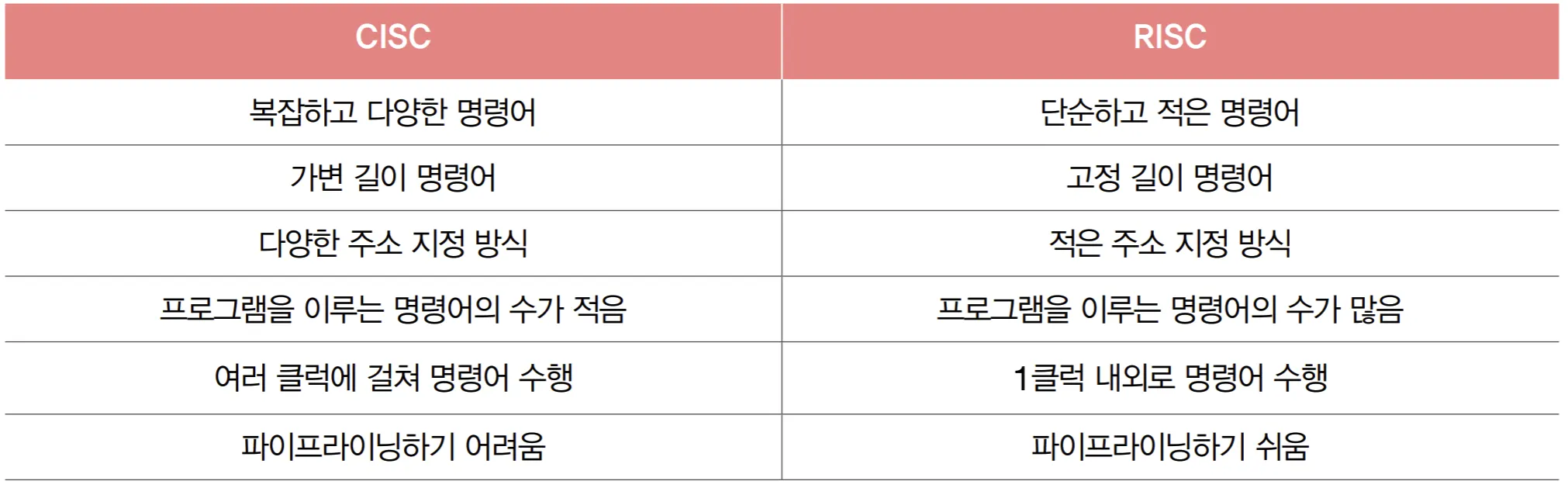 : ‘복잡한 명령어 집합을 활용하는 컴퓨터(=CPU)’를 의미. 복잡하고 다양한 명령어를 활용하는 CPU 설계 방식. x86, x86-64가 대표적