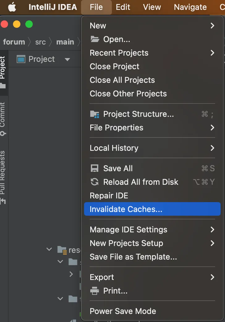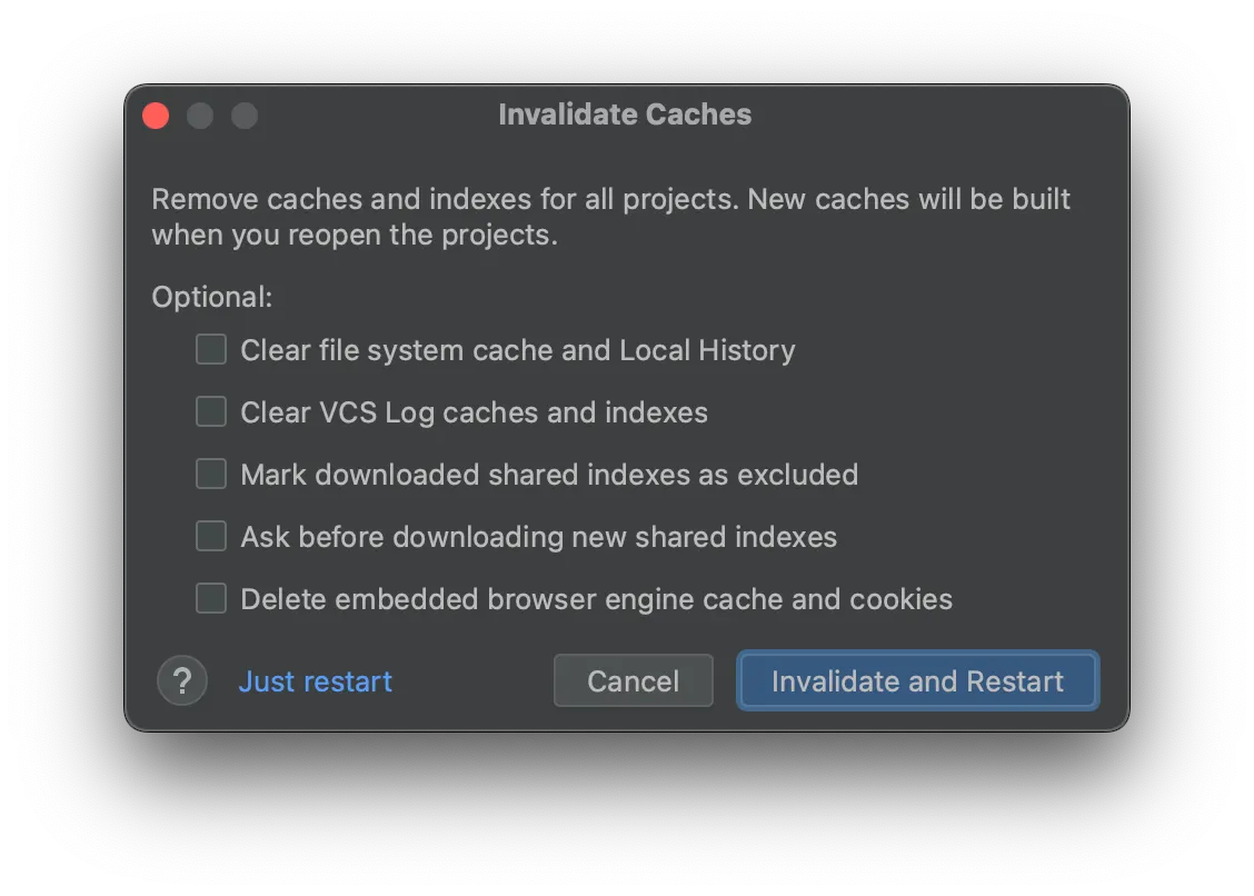 별도 옵션은 체크 안 하고 Invalidate and Restart 눌러서 재시작하니 해결됨