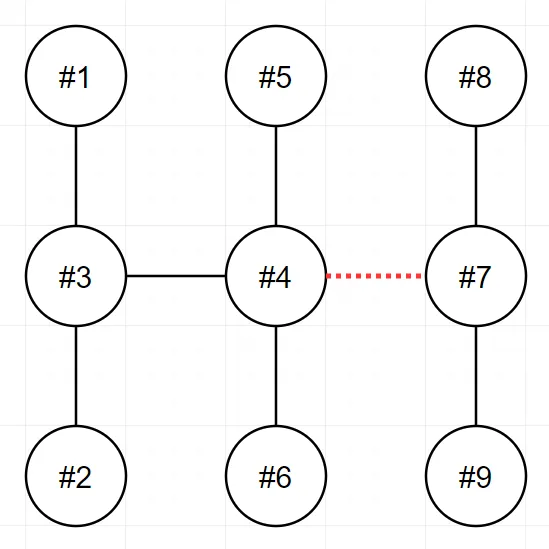 4번과 7번을 연결하는 전선을 끊으면 두 전력망은 각 6개와 3개의 송전탑을 가지며, 이보다 더 비슷한 개수로 전력망을 나눌 수 없습니다.