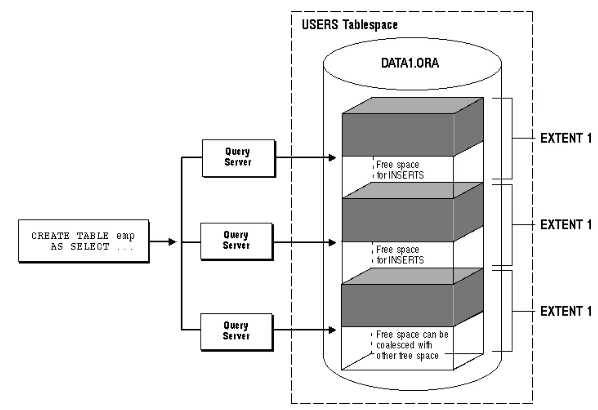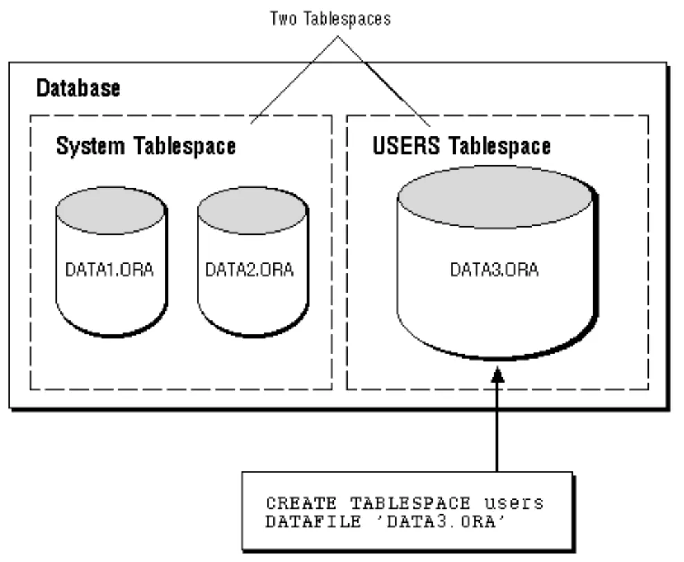 schema object(테이블 또는 인덱스)를 생성하면 해당 테이블의 세그먼트가 지정된 테이블 스페이스에 생성됨. 즉, 테이블 스페이스를 이루는 하나 이상의 파일들에 걸치거나 걸치지 않고 생성될 수 있음. 하지만 테이블 스페이스 두 개이 상을 걸쳐서 생성되지 않고, 오직 하나의 테이블 스페이스에 속하게 됨