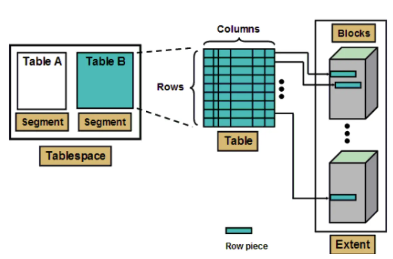 오라클 내부에서는 데이터 블록(data block), 익스텐트(extent), 세그먼트(segment), 테이블스페이스(tablespace)라는 논리적 단위로 데이터를 관리함