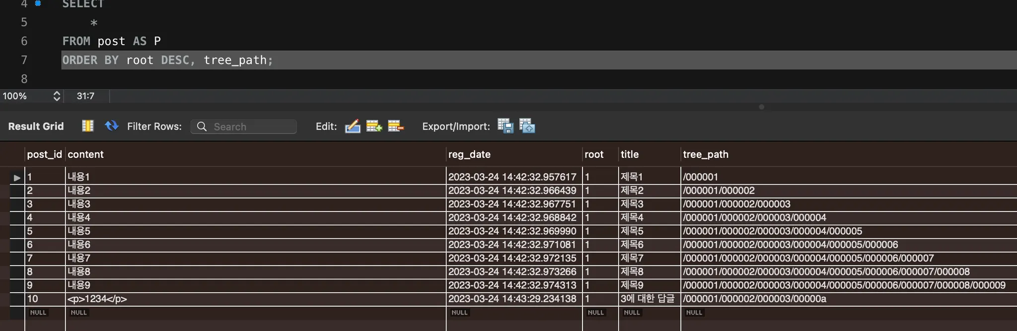 (๋ค์ฌ์ฐ๊ธฐ ๊น์ด) * (๊ณ ์ ์์ด๋ ๊ธธ์ด) ๋งํผ ์ ๋ ฌ์ฉ treePath ์ธ๋ฑ์ค๊ฐ ๋งค์ฐ ๊ธธ์ด์ง๋ ๋ฌธ์ ๊ฐ ์๊น