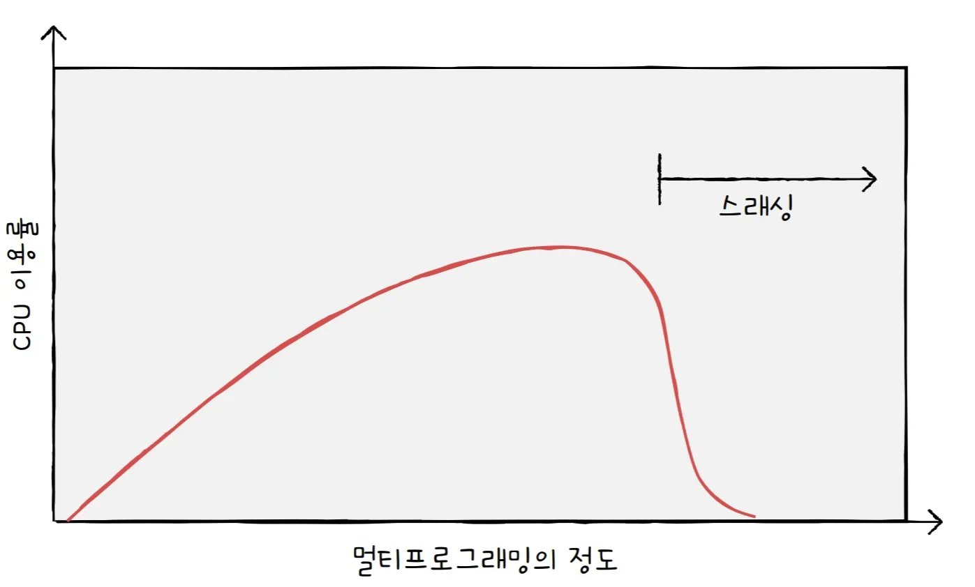 동시에 실행되는 프로세스 수가 어느 정도 증가하면 CPU 이용률이 높아지지만, 필요 이상으로 늘리면 각 프로세스들이 사용할 수 있는 프레임 수가 적어지기 때문에 페이지 폴트가 지나치게 빈번히 발생하고, 이에 따라 CPU 이용률이 떨어져 전체적인 성능이 저해됨