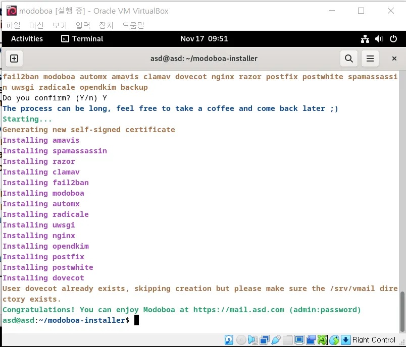 중간에 Y/n 나오면 y 해주고, 꽤 오래 기다리면 설치가 완료된다.
