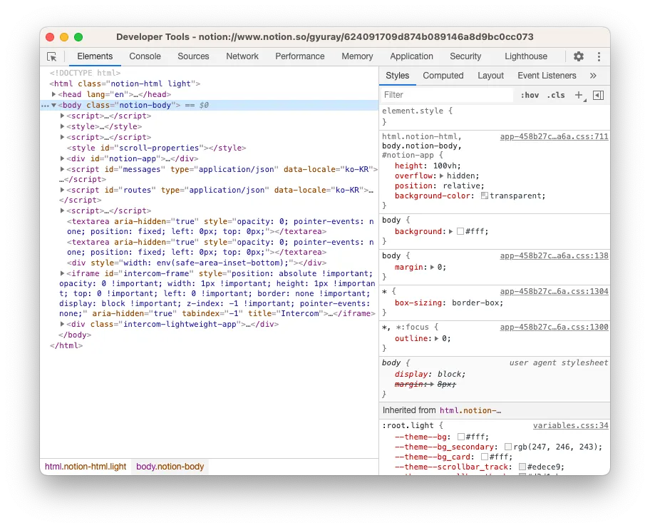 원래 메뉴를 여는 단축키가 별도로 존재하지만 현재 버그로 인해 먹히지 않는다. Option + CMD + I로 개발자도구를 열어준다.