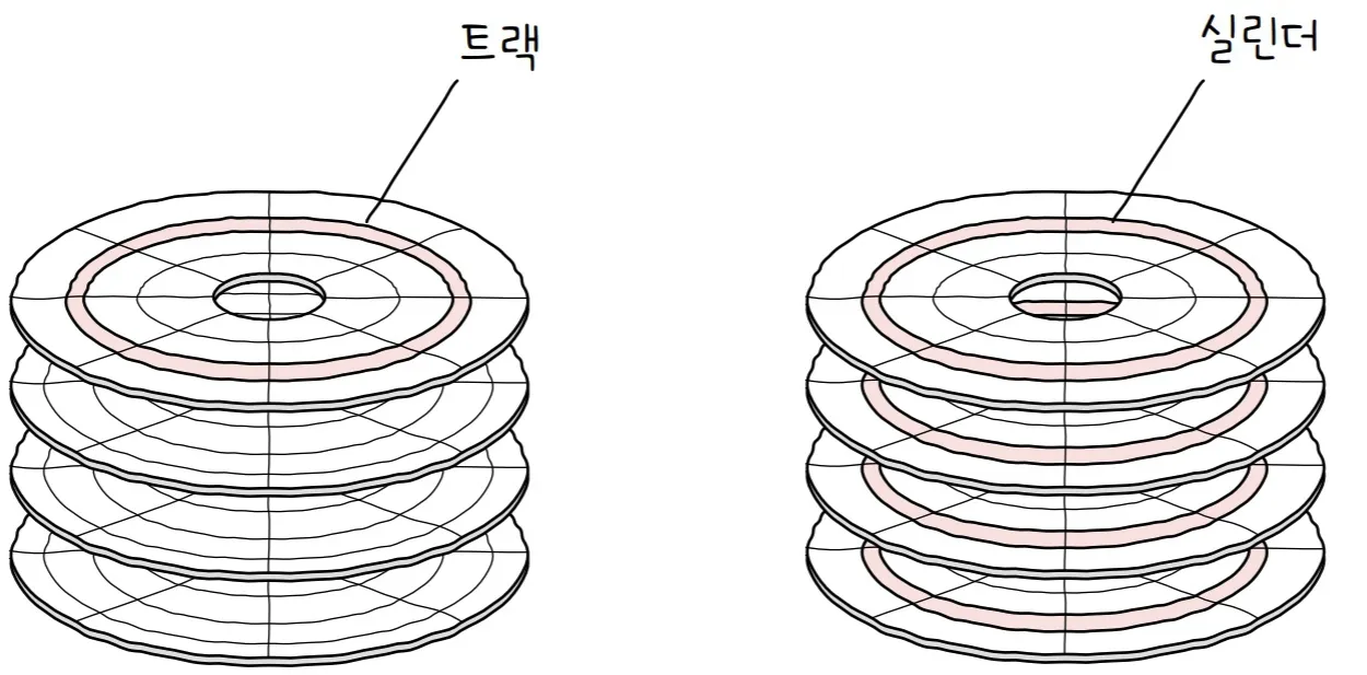 : 여러 겹의 플래터 상에서 같은 트랙이 위치한 곳을 모아 연결한 논리적 단위. 연속된 정보는 보통 한 실린더에 기록됨. 디스크 암을 움직이지 않고도 바로 데이터에 접근할 수 있기 때문