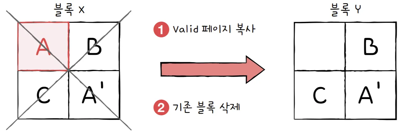 가비지 컬렉션은 삭제할 페이지가 있는 블록에서 Valid 상태인 페이지들만 다른 블록으로 복사한 후 기존 블록을 삭제하여 공간을 정리하는 기술