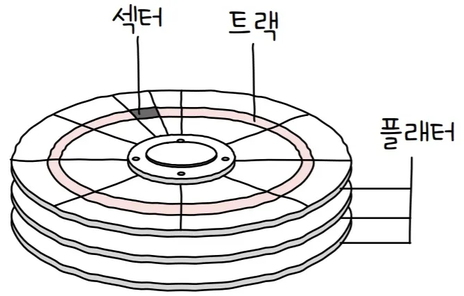 플래터는 트랙(track)과 섹터(sector)라는 단위로 데이터를 저장함