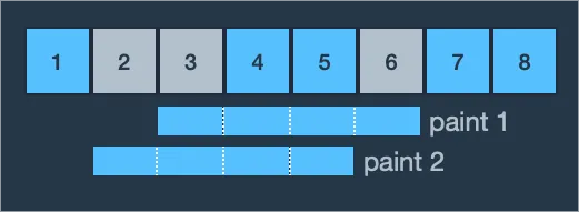 예제 1번은 2, 3, 6번 영역에 페인트를 다시 칠해야 합니다. 롤러의 길이가 4미터이므로 한 번의 페인트칠에 연속된 4개의 구역을 칠할 수 있습니다. 처음에 3, 4, 5, 6번 영역에 페인트칠을 하면 칠해야 할 곳으로 2번 구역만 남고 1, 2, 3, 4번 구역에 페인트칠을 하면 2번 만에 다시 칠해야 할 곳에 모두 페인트칠을 할 수 있습니다.