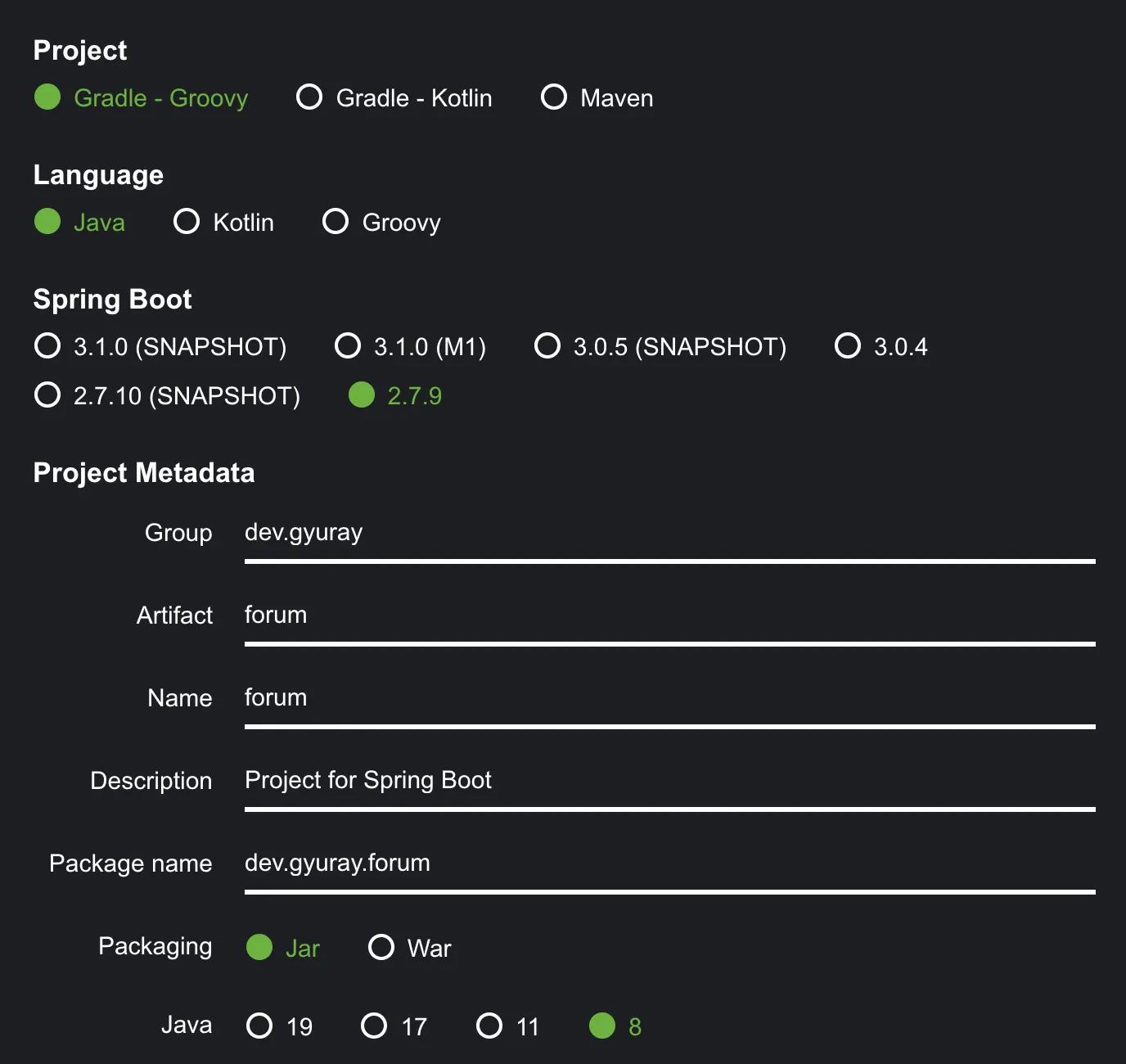 영한님은 자바 11을 권장하지만, 스프링에서 자바 11을 써야하는 정확한 이유를 찾지는 못했음. 일단 8로 돌려보며 추후에 문제가 생기는 지 확인해보고 싶어서 8로 선택.