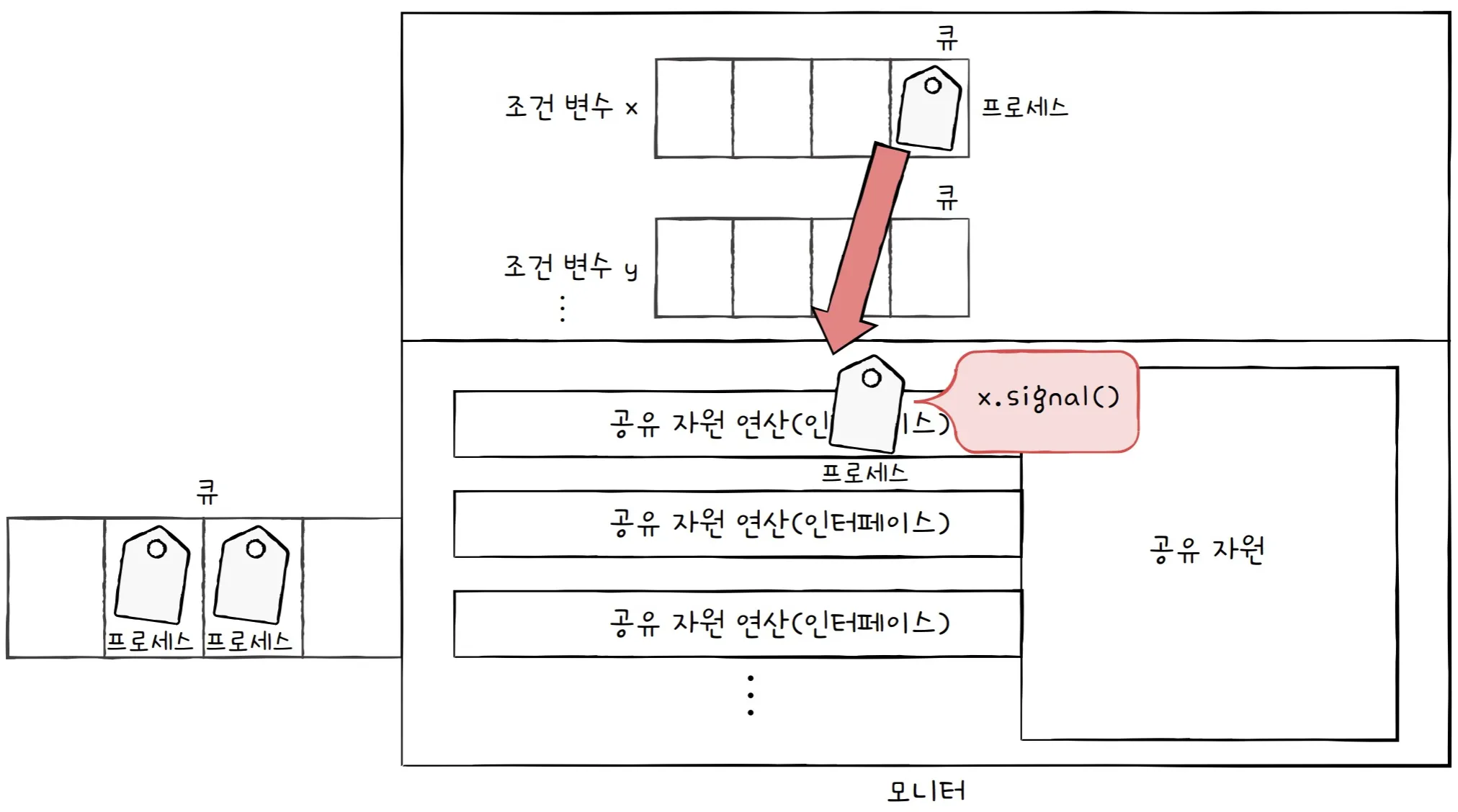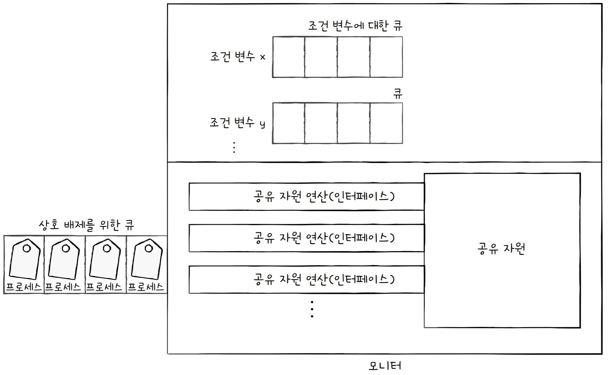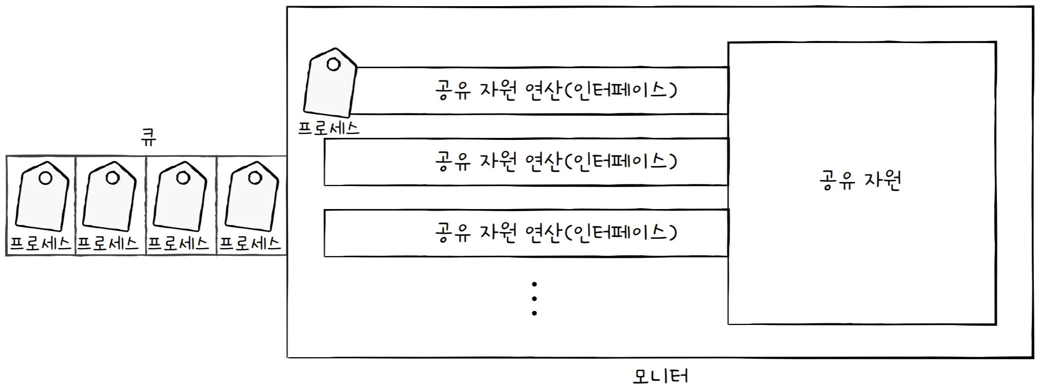 즉, 모니터는 공유 자원을 다루는 인터페이스에 접근하기 위한 큐(모니터에 진입하기 위한 큐)를 만들고, 모니터 안에 항상 하나의 프로세스만 들어오도록 하여 상호 배제를 위한 동기화를 제공함