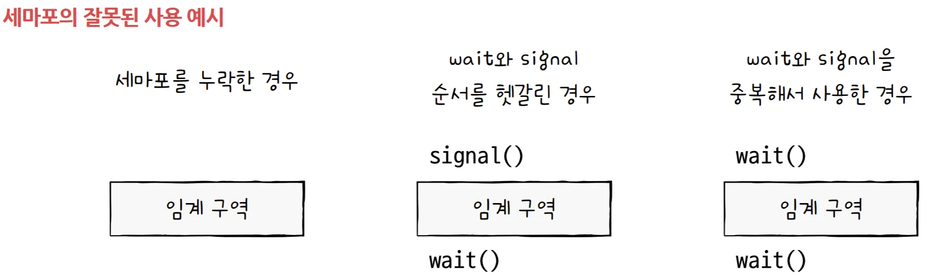 세마포는 ‘멈춤’ 신호와 ‘가도 좋다’는 신호로서 임계 구역을 관리함. 즉, 프로세스는 임계 구역 앞에서 멈춤 신호를 받으면 잠시 기다리고, 가도 좋다는 신호를 받으면 그제서야 임계 구역에 들어가게 됨