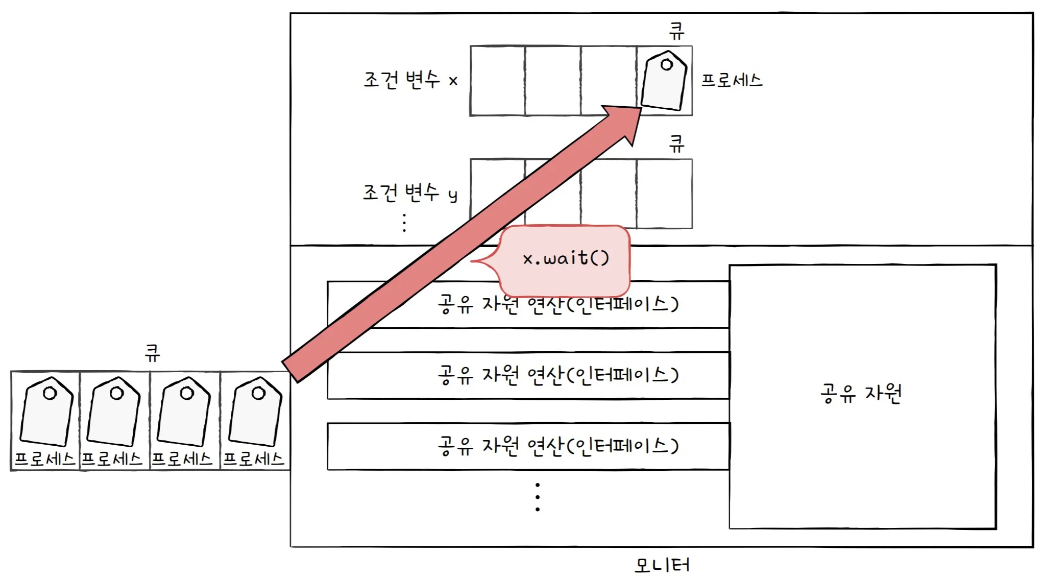 모니터에 진입한 어떤 프로세스가 x.wait( )를 통해 조건 변수 x에 대한 wait를 호출했다고 가정