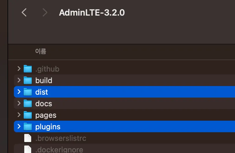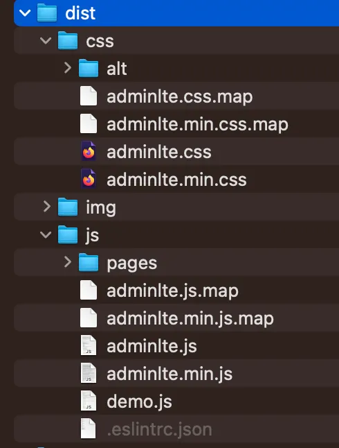 dist 파일을 보면 css와 js 파일임을 알 수 있다. 이 중 adminlte.min.css와 adminlte.min.js가 HTML 페이지에서 import되어 사용된다.