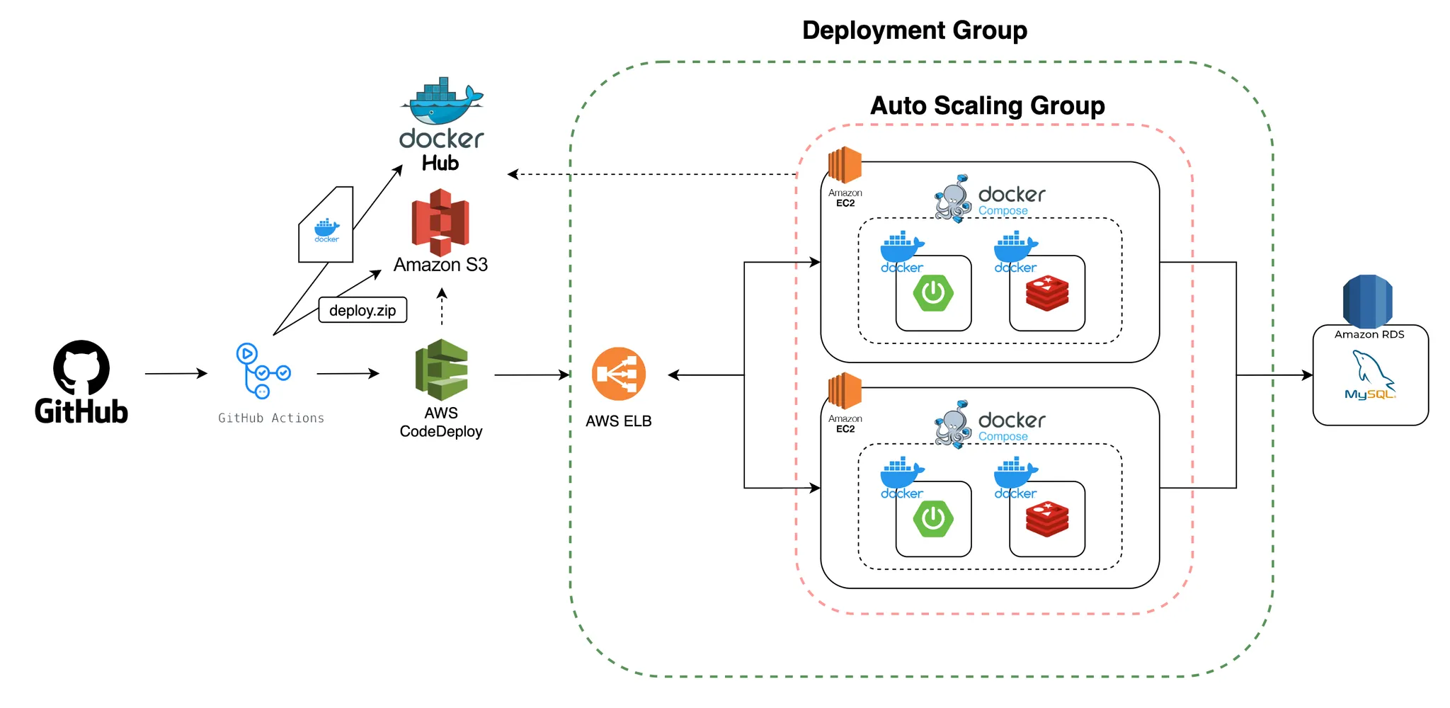 Github에 push → Github Actions 트리거 → 앱 및 도커 이미지 빌드 → S3 및 도커 허브에 파일 배포 → CodeDeploy에 의해 배포 트리거 → AutoScaling Group 생성 → Launch Template에 의해 EC2 Instance 생성 → Launch Template User Data로 docker-compose 실행