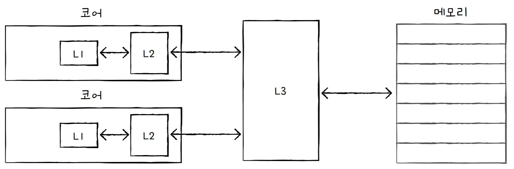 : L2 다음으로 코어와 가까운 캐시 메모리. 일반적으로 코어 외부에 위치함. 용량이 가장 크고 비쌈