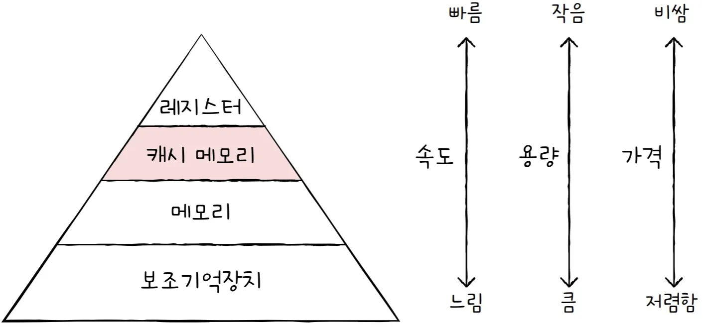: CPU와 메모리 사이에 위치하고, 레지스터보다 용량이 크고 메모리보다 빠른 SRAM 기반의 저장 장치