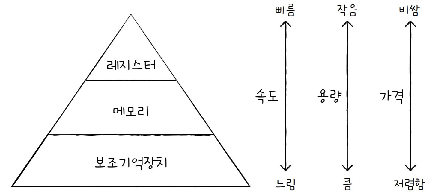 CPU와 가까운 저장 장치는 빠르고, 멀리 있는 저장 장치는 느림
