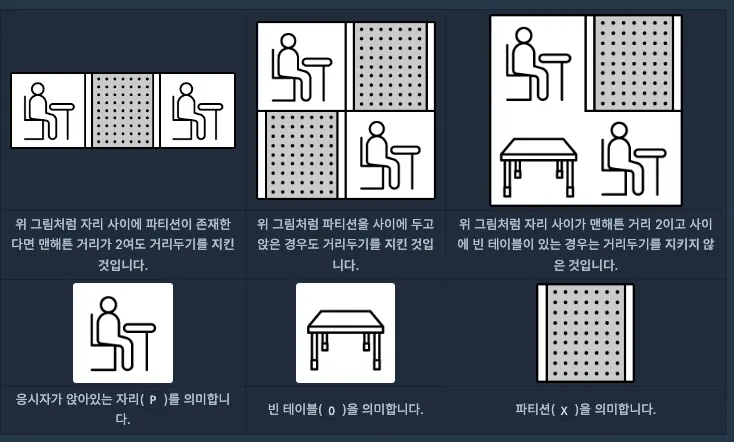 개발자를 희망하는 죠르디가 카카오에 면접을 보러 왔습니다.코로나 바이러스 감염 예방을 위해 응시자들은 거리를 둬서 대기를 해야하는데 개발 직군 면접인 만큼아래와 같은 규칙으로 대기실에 거리를 두고 앉도록 안내하고 있습니다.
