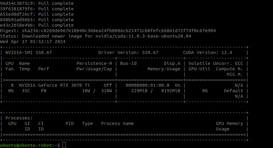 nvidia-container-toolkit이 정상적으로 설치되었다면 아래 명령어로 테스트해볼 수 있다.