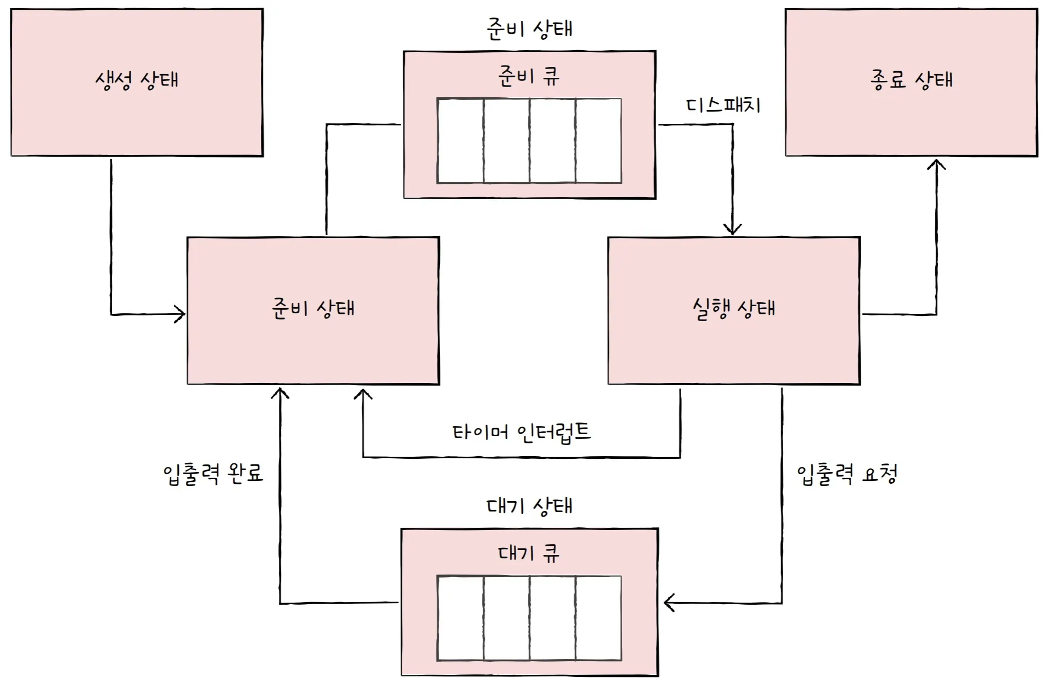 CPU는 메모리로 적재되고자 하는 새로 생성되는 프로세스, CPU를 이용하고 싶은 프로세스, 특정 입출력장치를 이용하고 싶은 프로세스 등을 큐에 삽입함