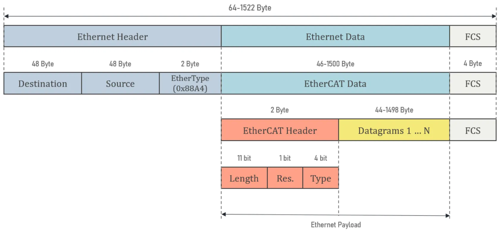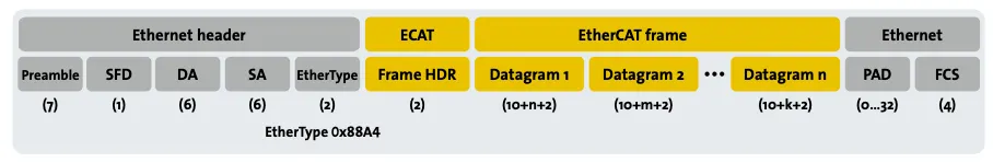 EtherCAT 프레임은 이더넷 프레임 내부에 들어간다. EtherCAT 프레임은 이더넷 헤더 EtherType에 0x88A4 값을 가진다.