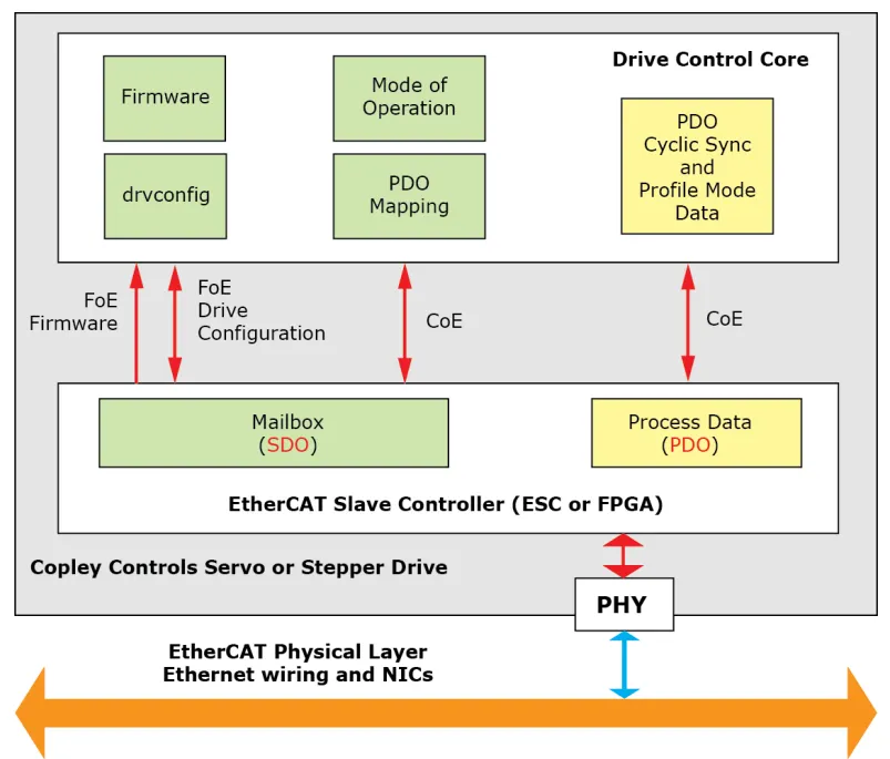 CANopen 프로토콜의 개념과 원리 ). 이CAN Application Protocol over EtherCAT (CoE)을 통해 CANopen 통신을 EtherCAT을 통해 구현할 수 있다. CANopen의 OD(Object Dictionary), PDOs(Process Data Objects), SDOs(Service Data Objects) 등을 지원한다. 또한 CiA 402, CiA 406 등 표준화된 CANopen 프로파일도 EtherCAT 통신에 재사용될 수 있다.