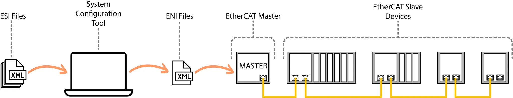 ENI는 EtherCAT 시스템의 네트워크 토폴로지, 슬레이브의 네트워크 상 위치, 모든 슬레이브 장치들의 process data structure 등을 정의하기 위해 사용되는 파일이다. 보통 EtherCAT 설정 툴을 사용해서 빌드된다. ENI 파일은 마스터가 네트워크를 초기화하고 각 슬레이브 노드와 통신하는 데 사용된다.