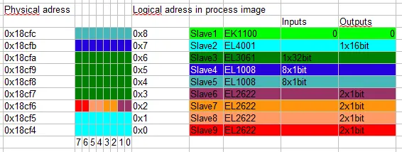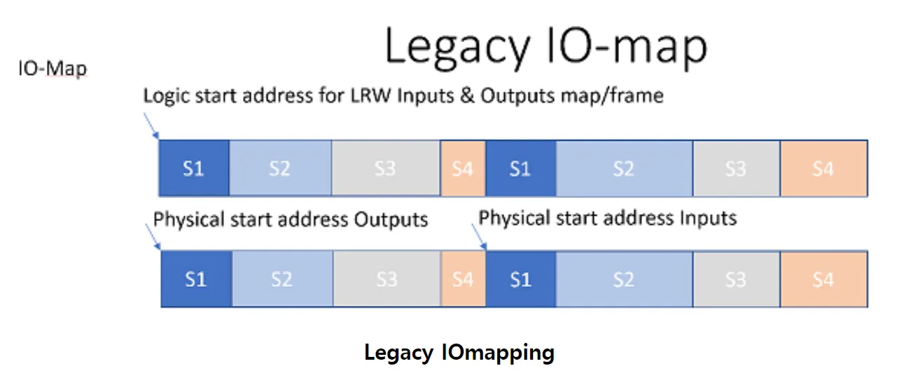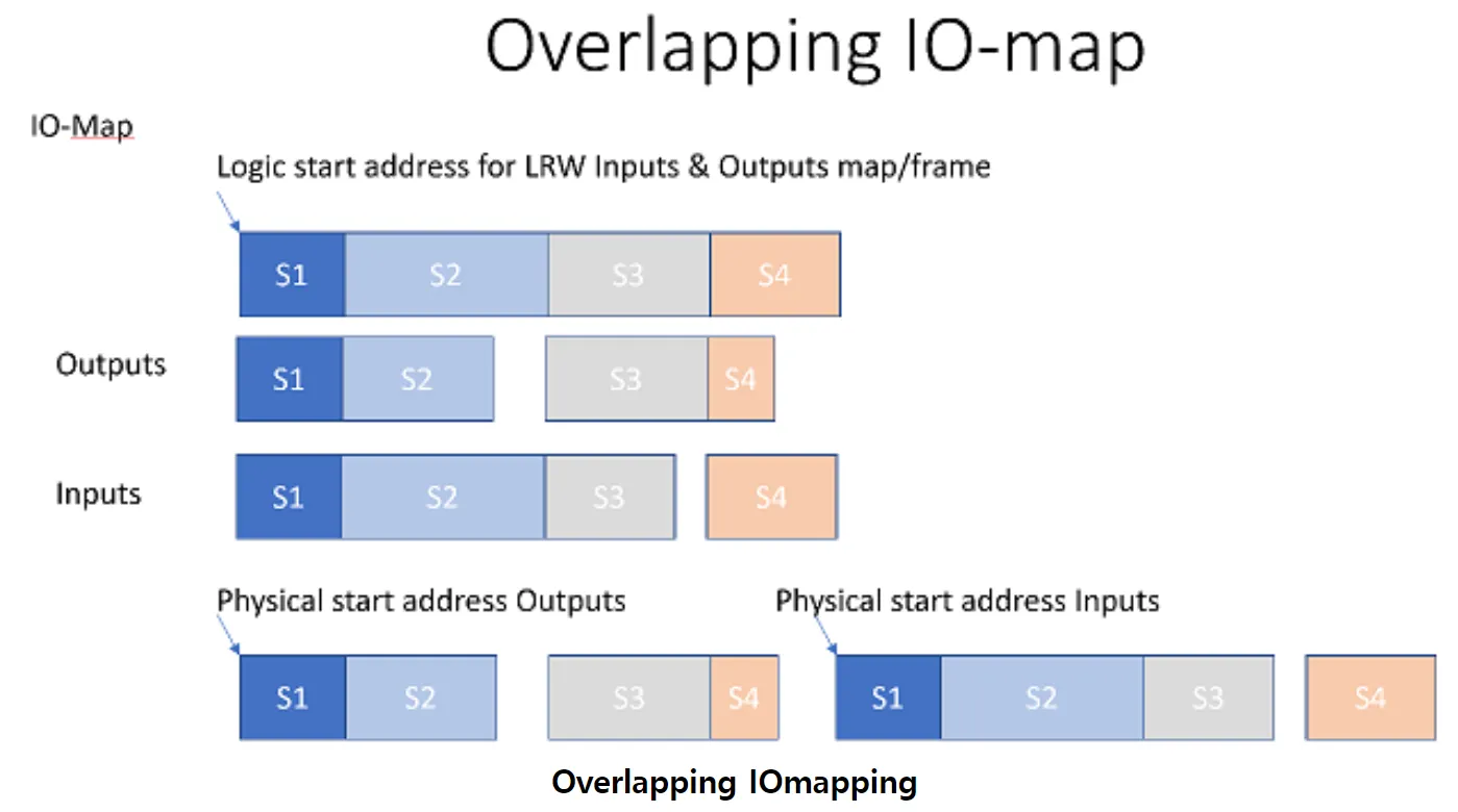 아래 예제를 보면 좌측의 master 메모리에 여러 슬레이브들의 input/output이 최대한 빈 칸 없이 매핑된 것을 볼 수 있다. 이것이 logical process image이고, 마스터 노드의 메모리에 저장된 맵(지도)이기 때문에 I/O map이라고도 부른다. 이 I/O 맵에 특정 순간에 실제 데이터가 들어오면 해당 시점의 process image가 된다.