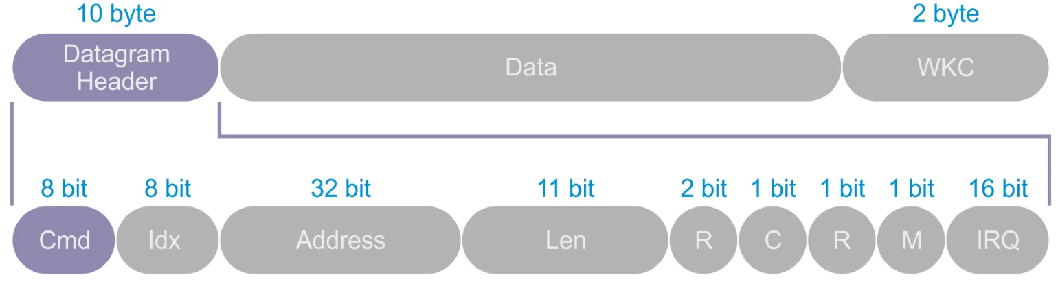 데이터그램 헤더는 EtherCAT 커맨드 타입에 대한 정보, 마스터가 중복되거나 누락된 데이터그램을 식별하기 위한 식별자, 주소 명세로 구성되어 있다.
