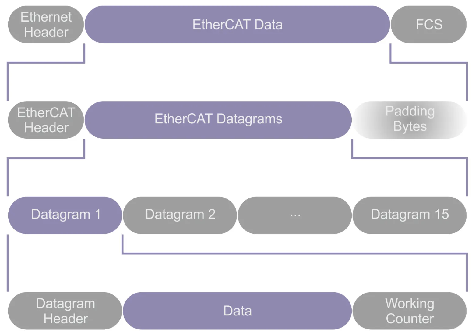 EtherCAT 프레임은 최대 15개의 데이터그램을 가질 수 있다. EtherCAT 프레임이 64바이트보다 작으면 1~32 바이트가 EtherCAT 데이터에 패딩으로 붙는다.