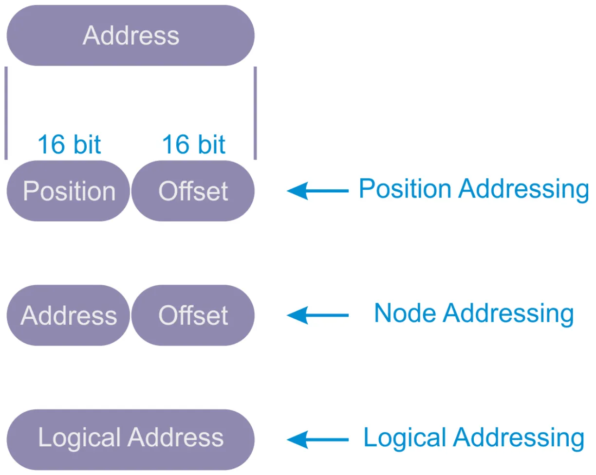 데이터그램은 Address 필드에 이 position address로 슬레이브 장치의 주소를 음(-)의 값으로 가지고 있는데, 각 슬레이브 장치는 이 주소값을 먼저 1 증가시킨 후, 연산 결괏값을 0으로 읽으면 본인을 목적 노드로 해석하고 데이터그램에 적힌 명령을 수행한다.