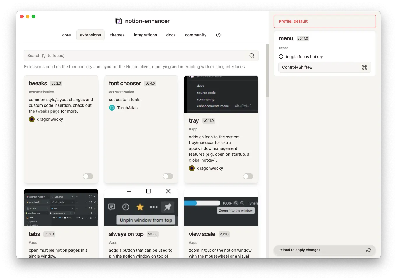 extentions 탭에서 원하는 확장 프로그램 선택 후 오른쪽 아래 Reload to apply changes 클릭