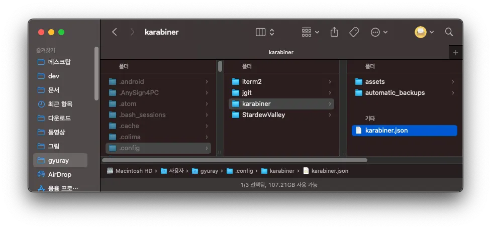 단축키 설정은 karabiner.json 파일을 수정해서 이루어진다. 파일 위치는 아래와 같다.