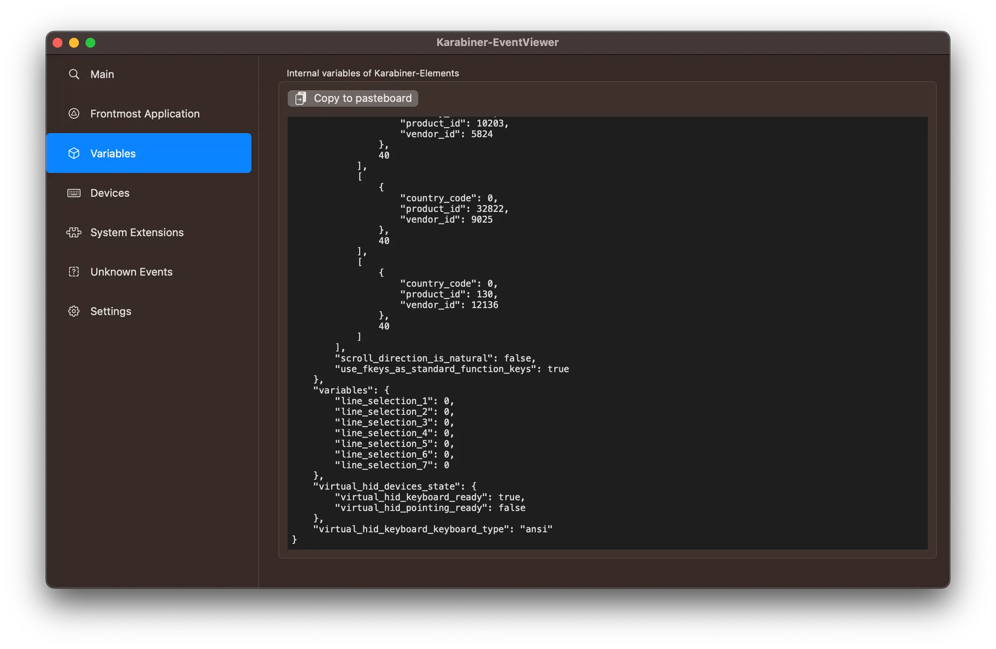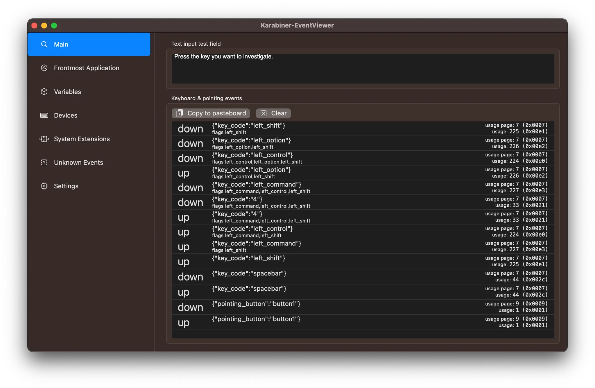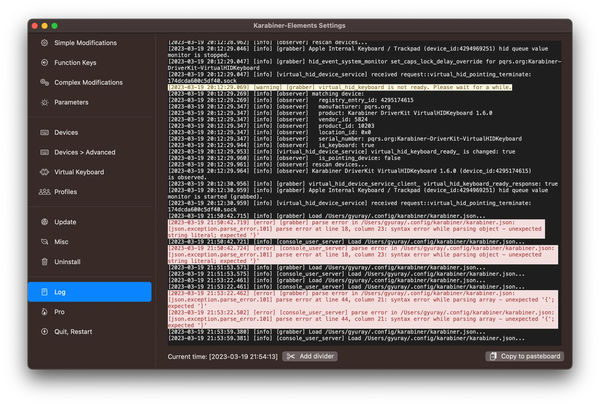 코드에 오류가 있을 경우 Complex Modifications가 깨끗해지며 매핑이 해제되는데, Karabiner Elements(본 앱)의 log 탭을 들어가면 정확한 오류 지점을 알 수 있어 빠른 디버깅이 가능하다.