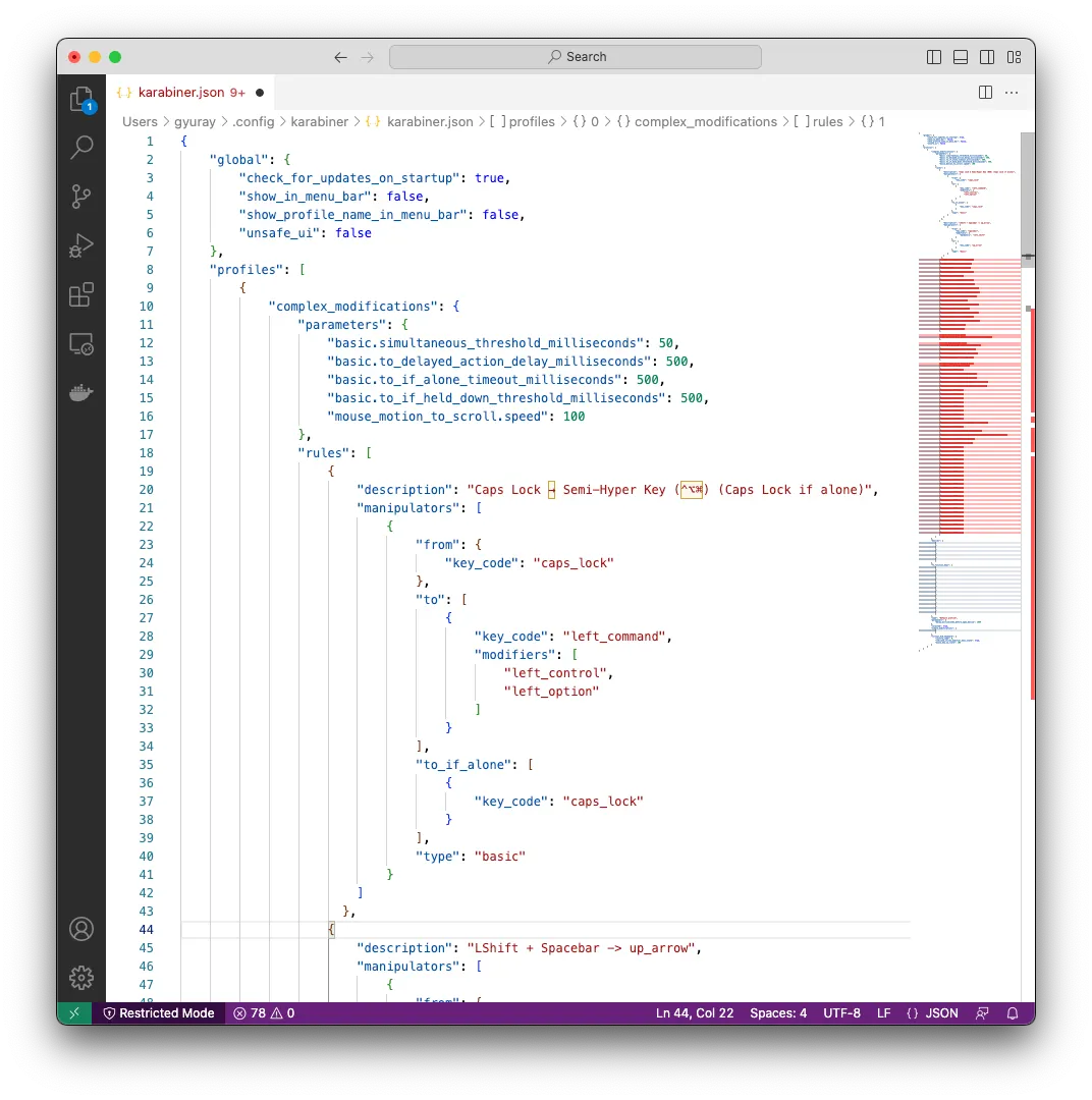 윈도우를 쓰던 때부터 AutoHotKey로 매핑해서 쓰던 버릇이 있어 맥으로 옮겨오느라 카라비너를 사용하게 됐다. 국내에는 complex modification(복합 매핑)에 관한 자료가 거의 없어서 혼자 많은 삽질을 하며 배웠다.
