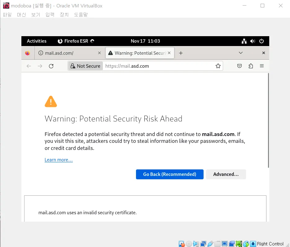 Debian에 기본 설치된 firefox로 가서 https://mailasd.com으로 접속해본다.