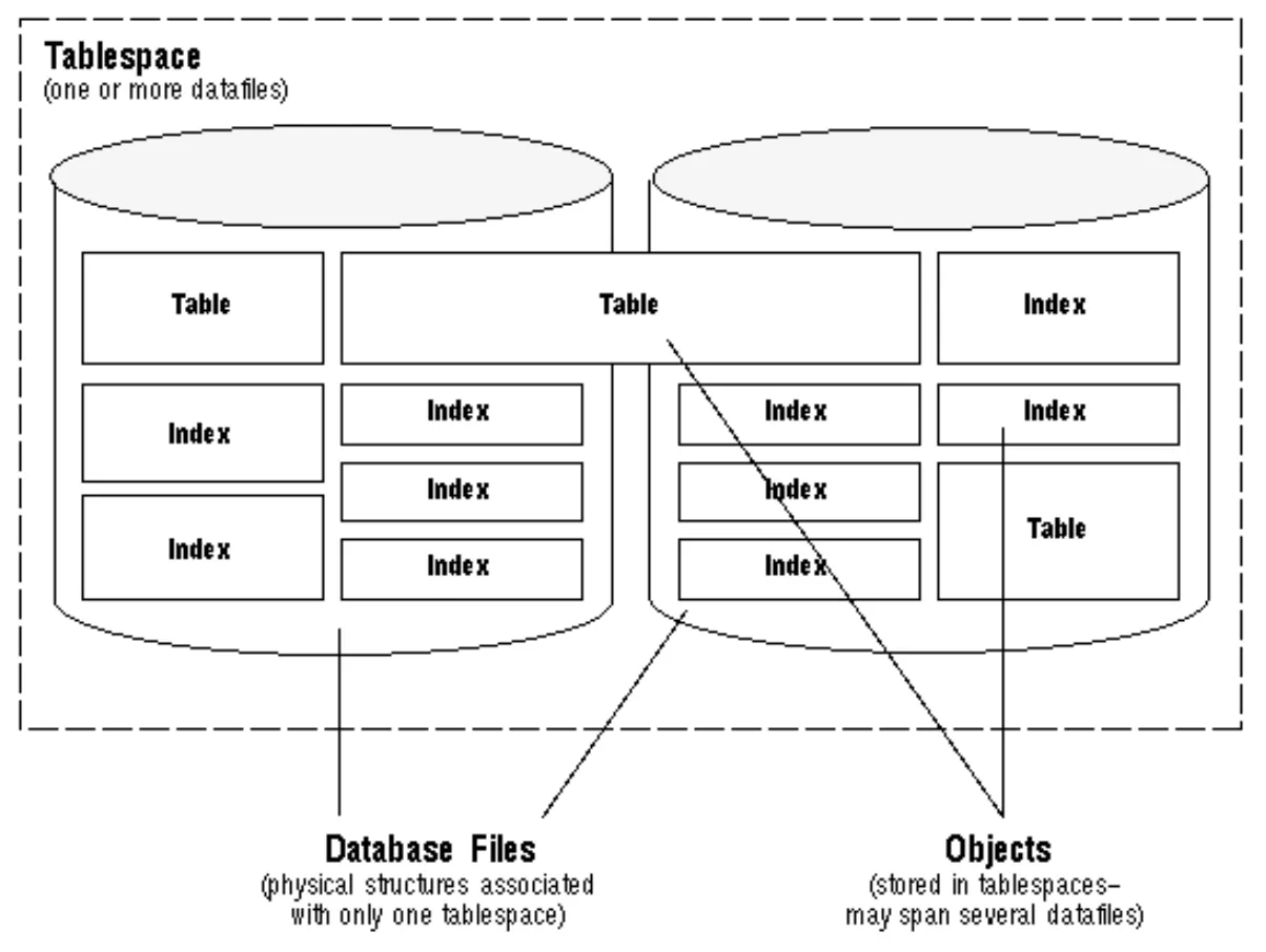 테이블, 인덱스 등의 객체들로 이루어져 있는데, 이 객체들은 하나의 테이블 스페이스에만 속하지만, 테이블 스페이스가 여러 데이터 파일을 가질 수 있기 때문에, 객체들 역시 여러 데이터베이스 파일에 걸칠 수 있음