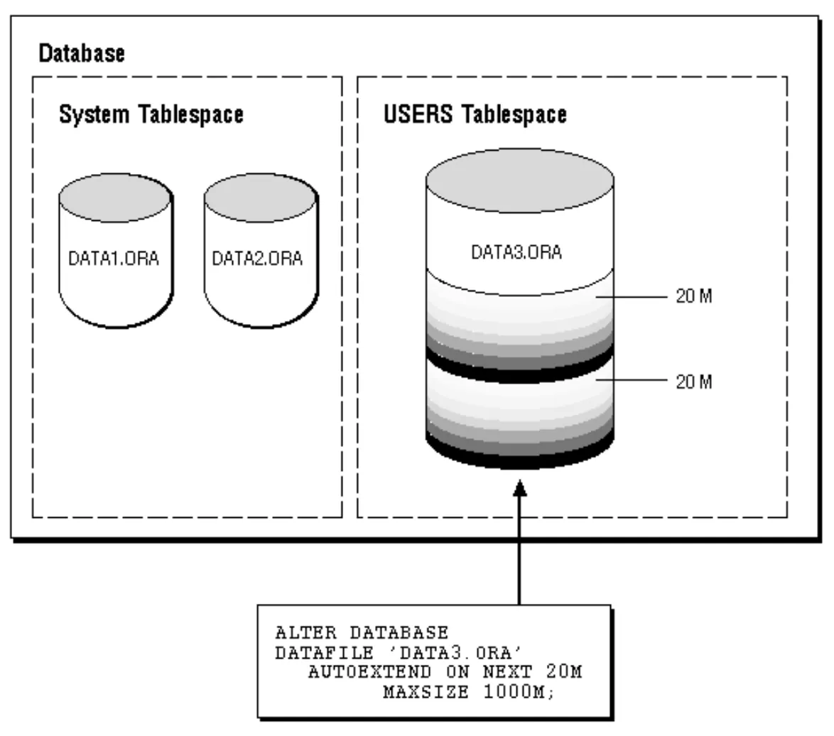schema object(테이블 또는 인덱스)를 생성하면 해당 테이블의 세그먼트가 지정된 테이블 스페이스에 생성됨. 즉, 테이블 스페이스를 이루는 하나 이상의 파일들에 걸치거나 걸치지 않고 생성될 수 있음. 하지만 테이블 스페이스 두 개이 상을 걸쳐서 생성되지 않고, 오직 하나의 테이블 스페이스에 속하게 됨