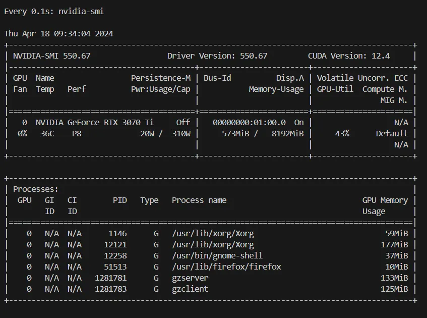 Container 내에서 Gazebo를 실행하면 호스트 머신에서 nvidia-smi를 실행하면 아래처럼 gazebo가 GPU를 물고 실행되는 것을 확인할 수 있다.